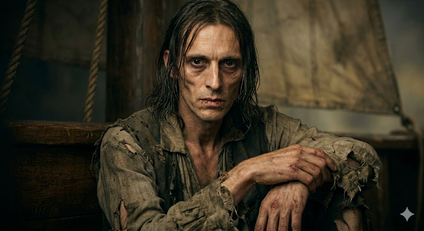 Il n’a pas de barbe pour cacher le creux de ses joues, et ses lèvres sont visiblement desséchées par la soif, par le sel d’eau de mer, et abîmées par les coups. De petites rides s’accrochent aux coins de ses yeux et ses mains sont abîmées et décorées d’écorchures et de bleus qu’il a obtenu par de nombreuses bagarres.